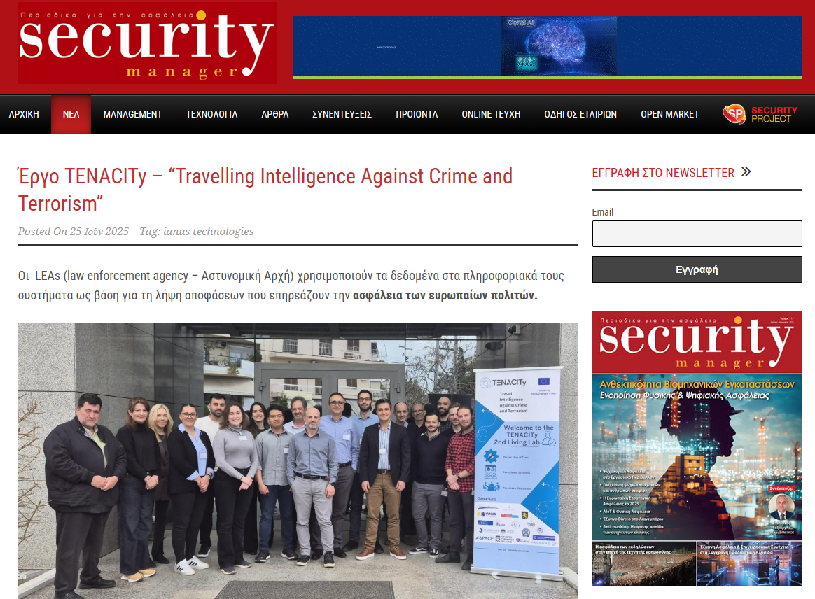 The TENACITy project has been featured in the Greek professional magazine Security Manager, a leading publication focused on security technologies, risk management, and innovation. The article, titled “Travelling Intelligence Against Crime and Terrorism,” presents TENACITy’s objectives, technological approach and its contribution to enhancing cooperation in the fight against crime and terrorism across Europe. This coverage […]
